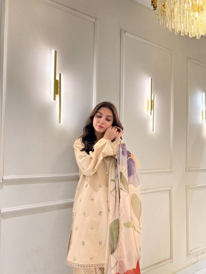 The Golden Bloom is crafted from luxurious lawn fabric, with delicate tonal embroidery in sandy gold and warm nude shades. Floral and vine motifs are embroidered on the front and sleeves, giving it a natural, soft feel. Fabric-covered buttons with a hint of sequins add a subtle touch of glamour, while the modest neckline and lace inserts at the hem and sleeves provide a refined finish. Paired with a matching Farshi Shalwar, the look is complete and timeless.