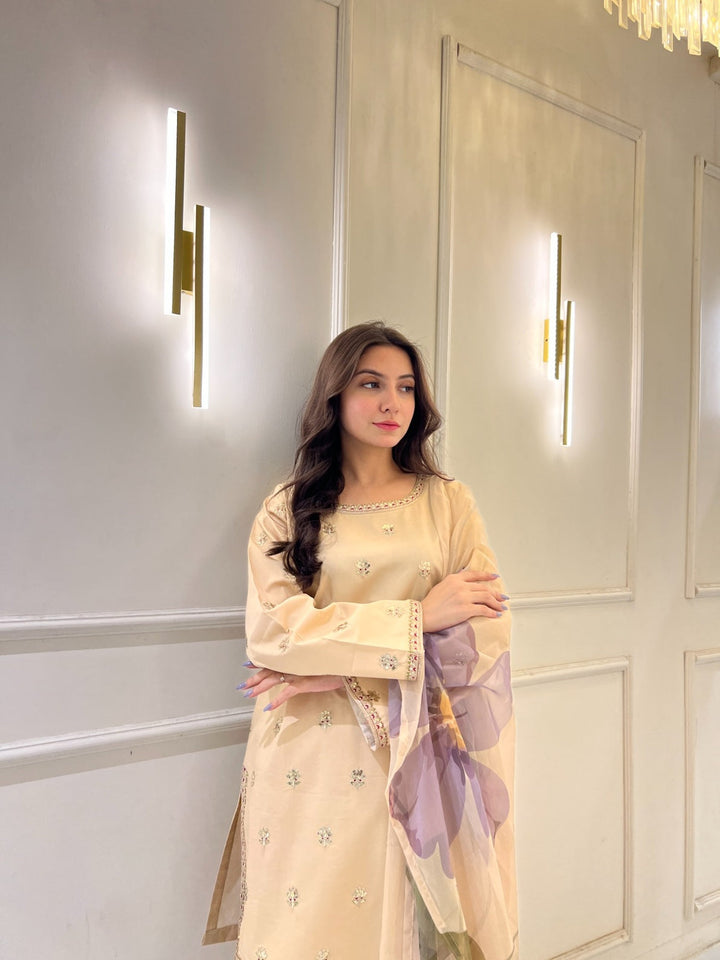 The Golden Bloom outfit is inspired by the serene beauty of windswept landscapes and soft, sunlit horizons. It blends subtle elegance with simplicity, featuring a soft mix of white, rosy pink, and nude-beige tones. Designed for the modern woman who values understated luxury, this ensemble is perfect for calm events like Eid or intimate gatherings, exuding a quiet sense of grace.