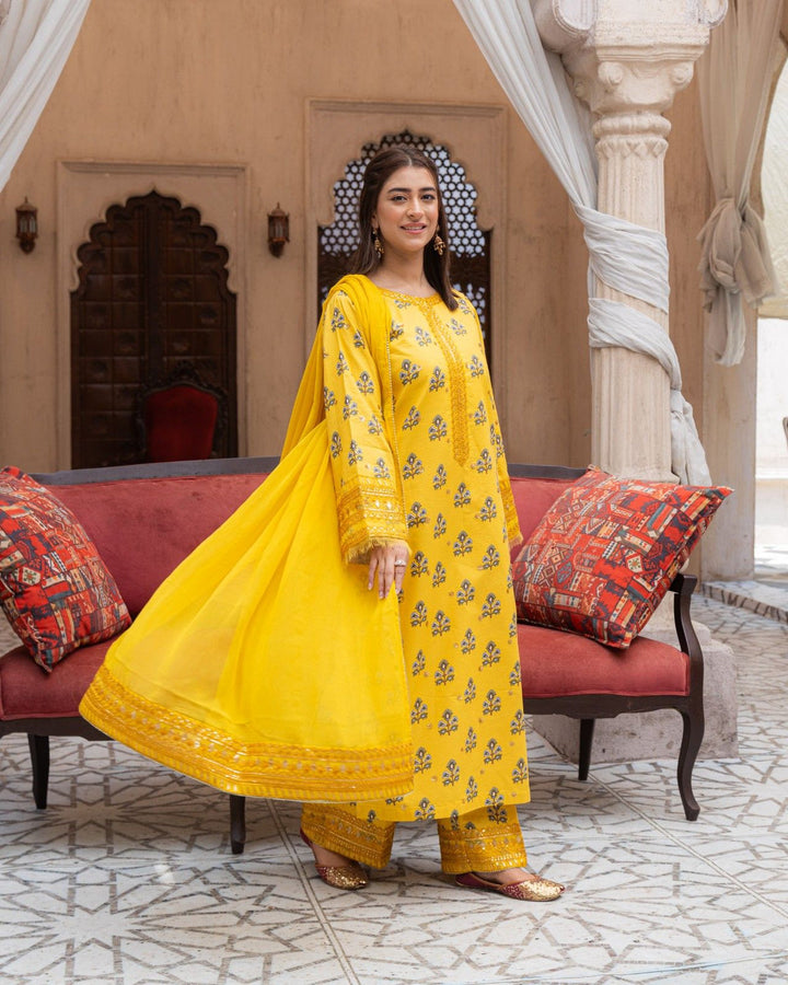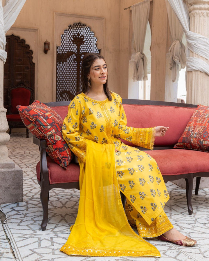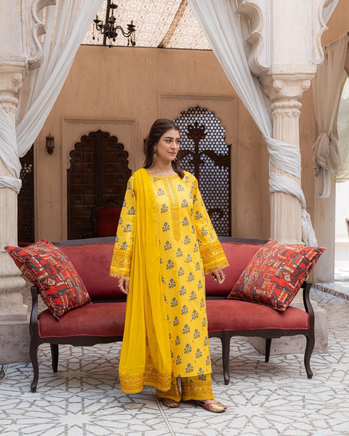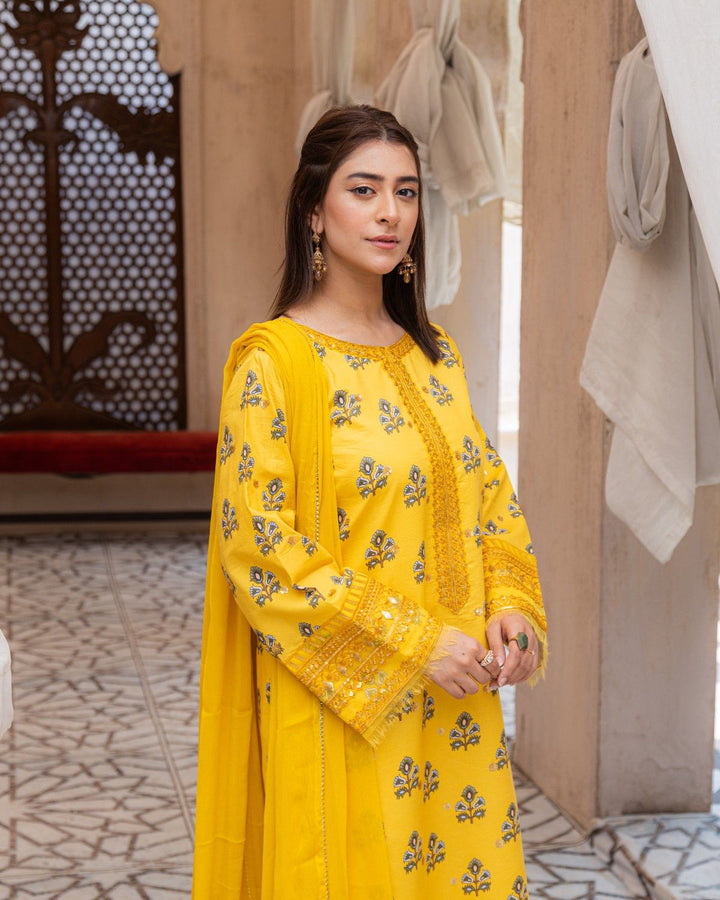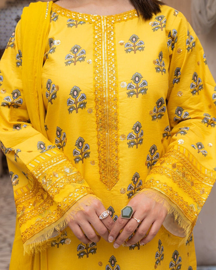 Crafted in a soft yellow hue, ZARD BAHAR/captures the essence of joyful elegance. The shirt and trousers are made from premium printed Lawn fabric, celebrated for its lightweight feel, breathability, and smooth drape. The delicate floral prints are brought to life with exquisite sequins embroidery placed thoughtfully on the shirt, sleeves, neckline, and trouser—adding subtle sparkle and sophistication without overwhelming the design.